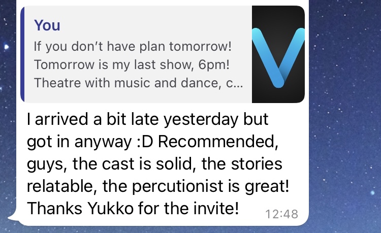 Thanks audiences, to share your feeling with us. People is important in theatre!